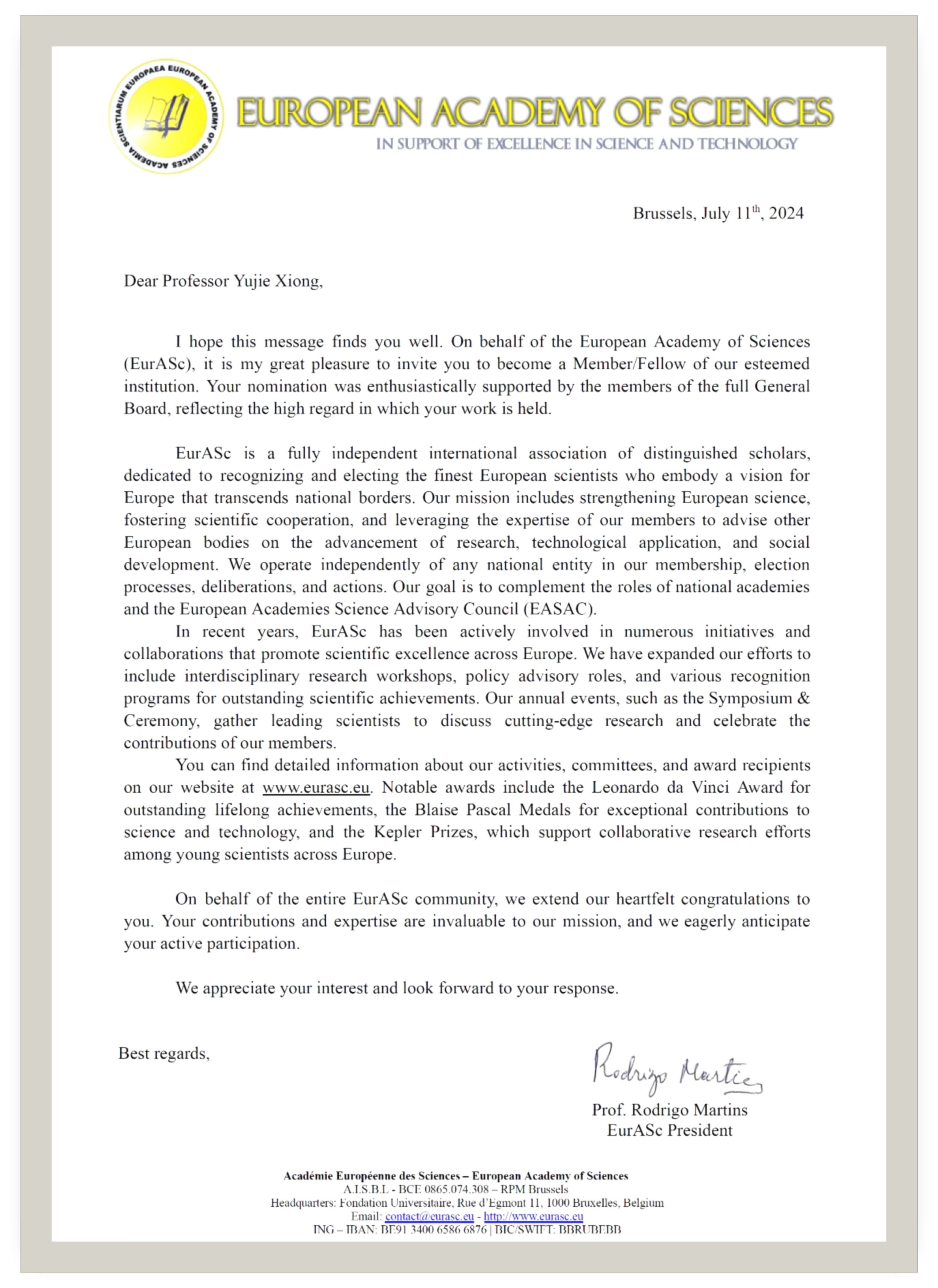欧洲科学院(European Academy of Sciences,简称EurASc)召开理事会,增选产生新一批院士。在理事会选举中,我校党委副书记、常务副校长熊宇杰教授正式当选为其材料科学学部外籍院士(Non-EU Fellow)。